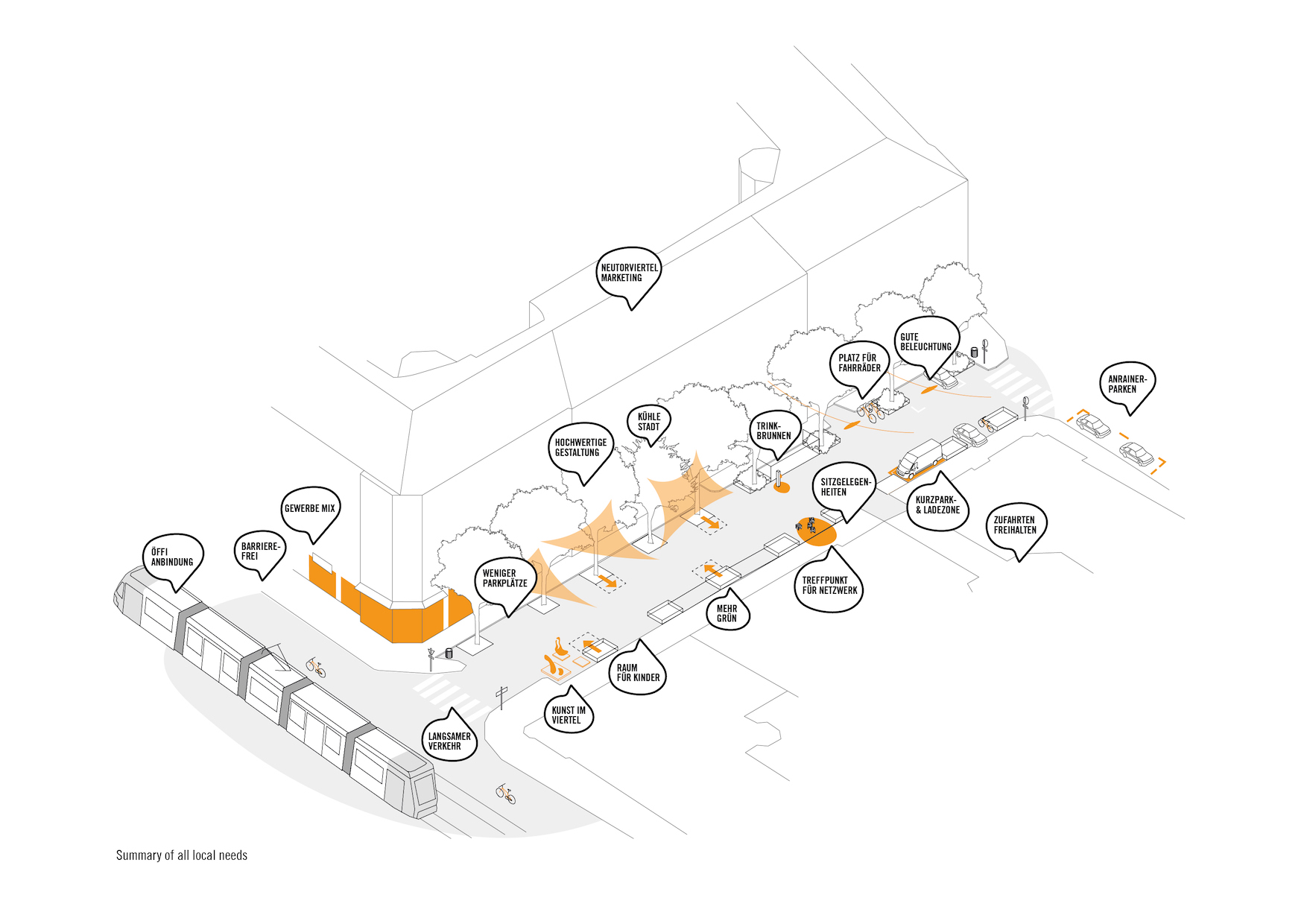 In a moderated, participatory process, a section of a residential street was temporarily redesigned in collaboration with residents and business owners. The goal was to test the planned traffic calming measures in the western part of downtown Graz and make the resulting benefits tangible. The street was cleared of unnecessary elements, and parking spaces were removed. Residents and users were invited to reimagine Kaiserfeldgasse as a ‘blank canvas.’ Street furniture made of wood was built on-site, reflecting the wishes of the participants. This encouraged reflection on the long-term design of the Neutorviertel. The result was a temporary shared space that invited appropriation and involved the entire street in the process. Based on the results of this intensive preparatory co-production process, the entire neighborhood was redesigned.